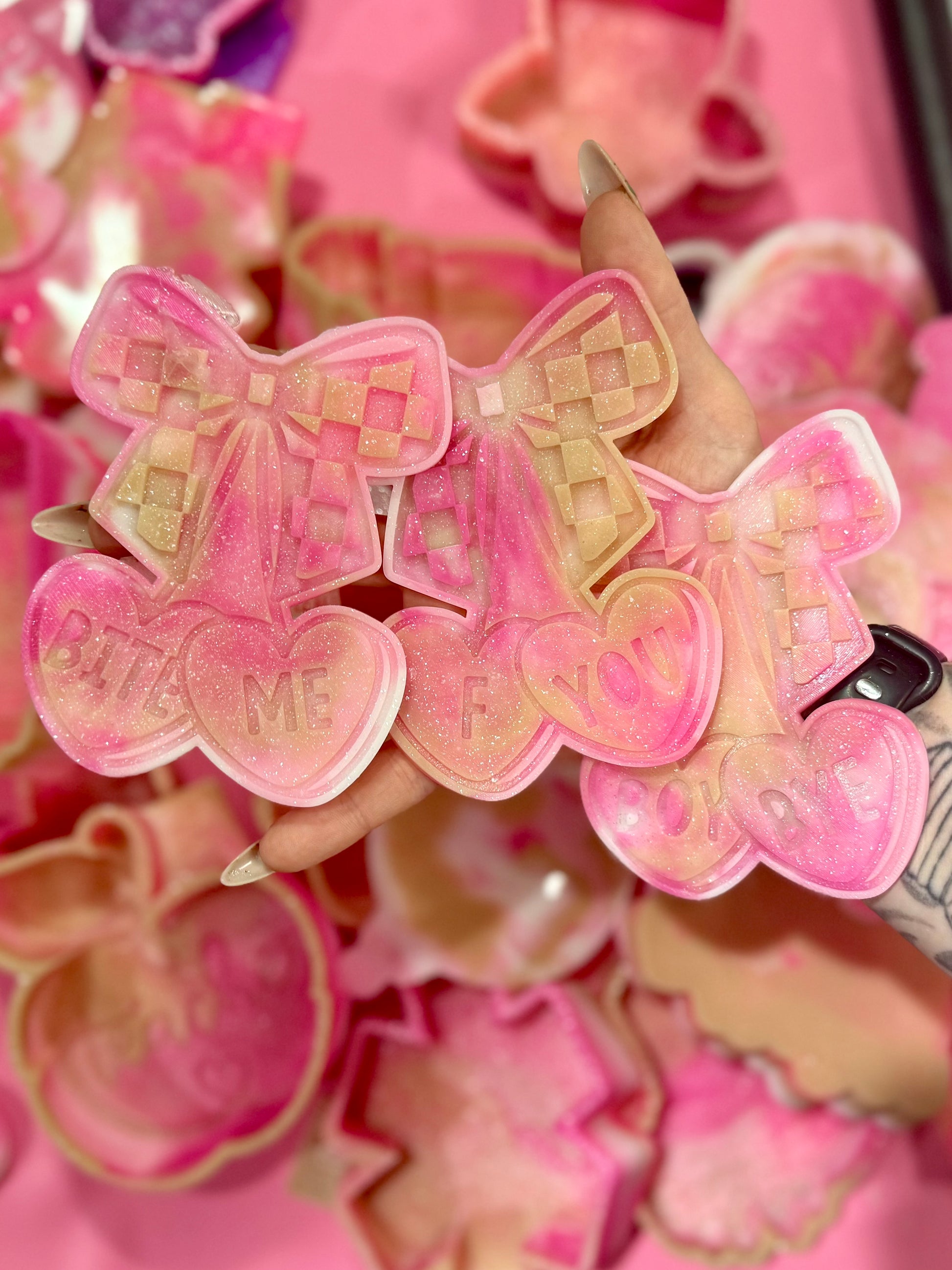 *most molds will have a marking on the top of them due to the process of taking them out of the housing. This will not cause issue with any freshie or resin art made
