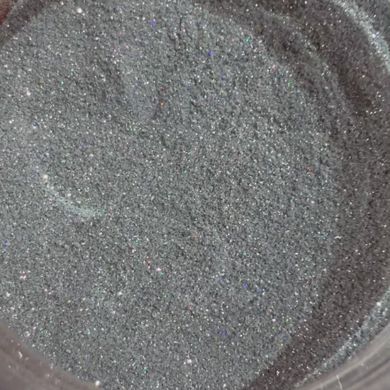 True holographic silver ultra-fine glitter with intense rainbow reflection. A solid silver base packed with full-spectrum holographic sparkle that flashes vibrant color from every angle. Pure rainbow holo, smooth, bright, and high-shine